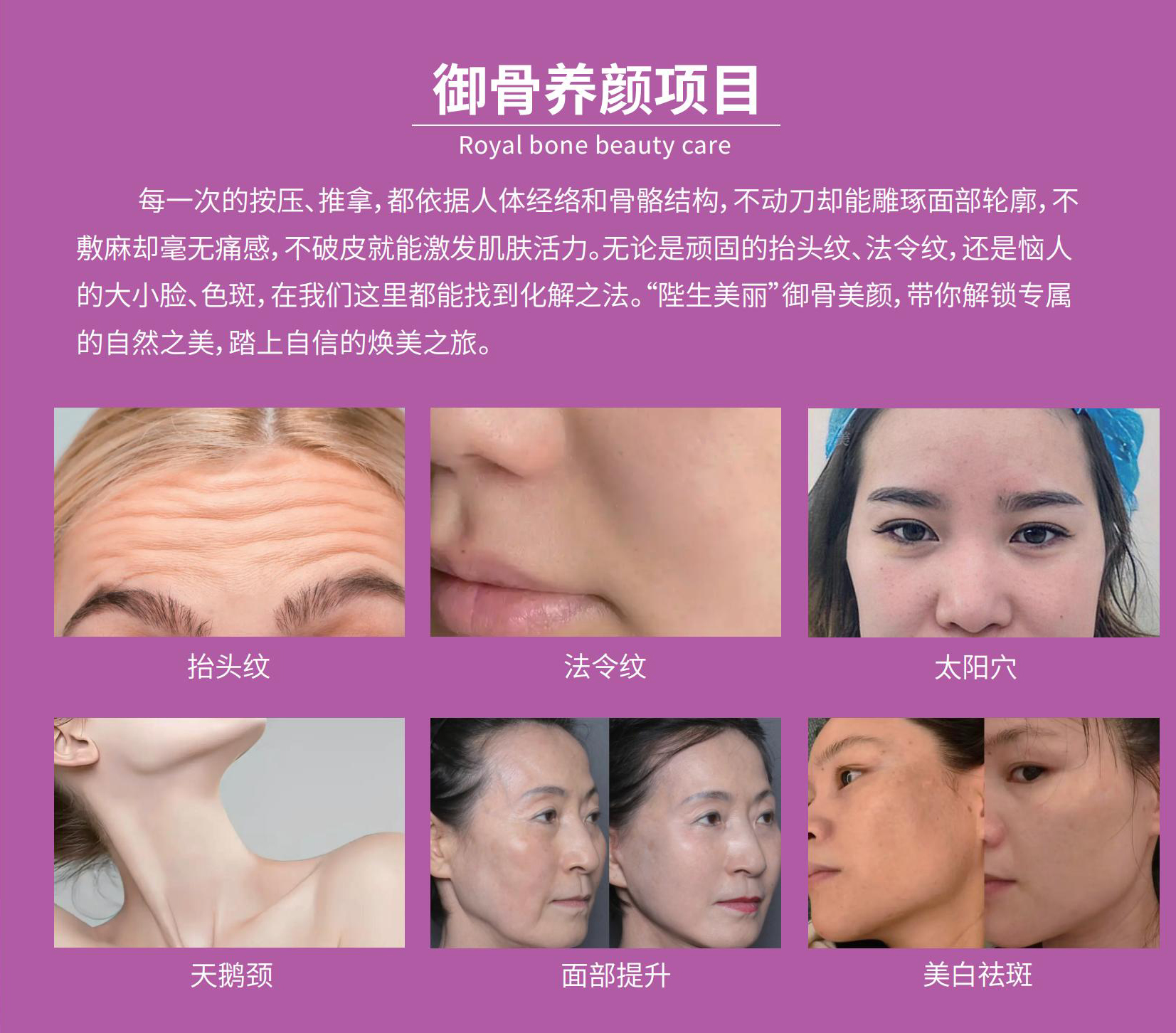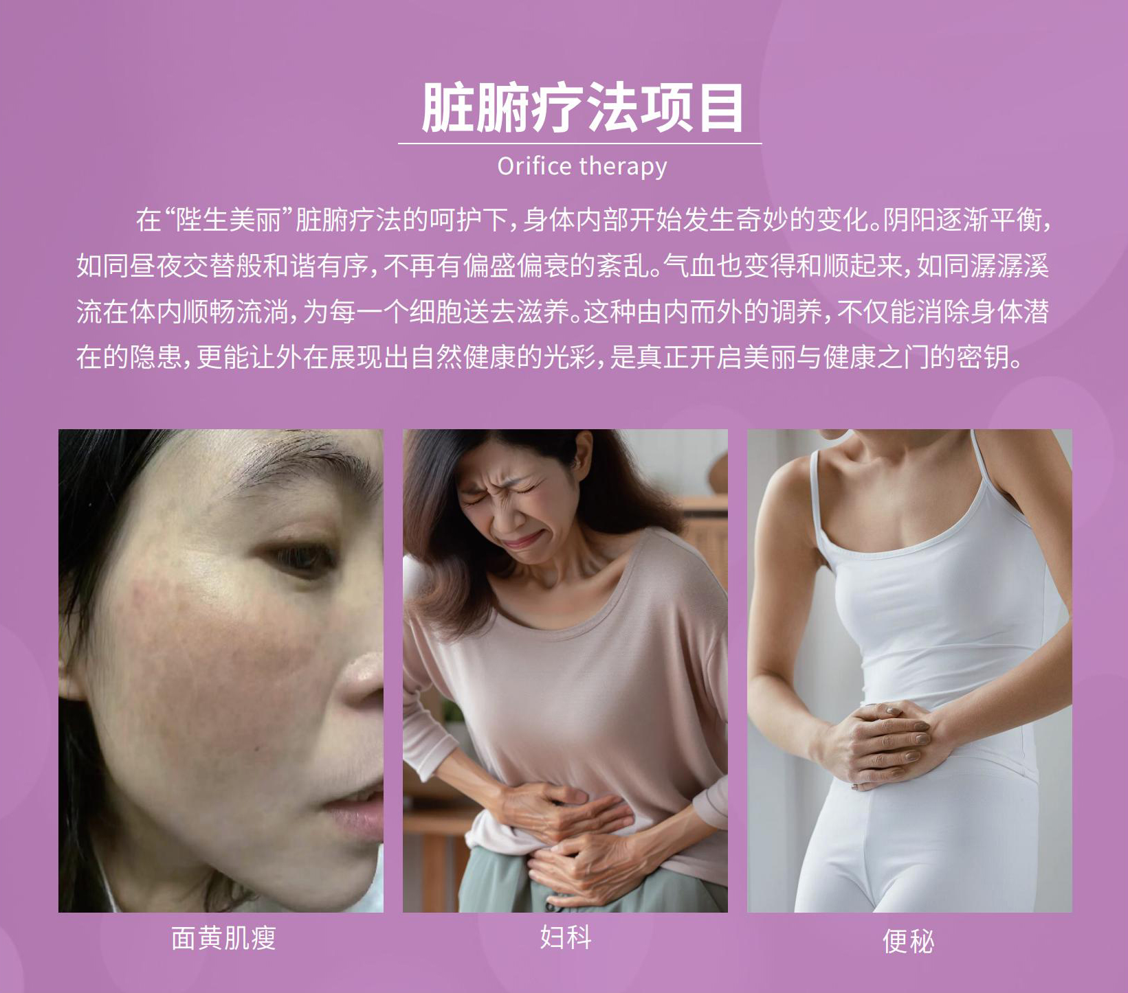 陛生美丽,主要以百年传承中医轻柔体态调衡技术,如御骨美颜术、整骨整形术、脏腑疗法、产后康复五大项目,通过古法秘方炮制技术,把上百种药食同源中草药经科学配伍,36道古法发酵后转化为无需熬煮的中式配方药食同源饮品,利用“内调外养,双效兼顾”帮助30—55岁尊贵女性从内而外散发自然光彩。